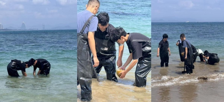几乎每个周末包括寒暑假,队员们背着采样包奔赴海南东部海岸。在新村湾潮间带,他们跪在滩涂上用标尺测量海草密度,趴在礁石间拍摄植被分布,累计划定1.5m×1.5m样方120个,徒步踏查海岸线超50公里。“第一次采样时被贝壳划破手,但看到GPS记录下的退化区域图,就觉得伤口值得。”大二员工王雨鑫翻开磨损的笔记本,里面贴满不同时期的海草叶片标本—2024年5月,新村湾海草密度为120株/㎡,到2024年12月已降至45株/㎡,物种从8种减少至3种。团队还在退潮间隙采集海水与底质样本200余份,用pH试纸、溶解氧仪等简易设备完成基础检测,发现陆源污染与渔业活动是导致海草退化的主因。