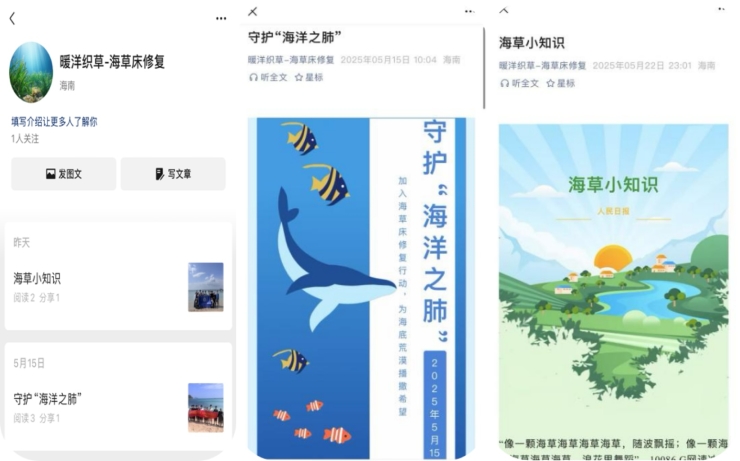 从课堂理论到海边实践,这群老员工用一年时间,让“海洋绿肺”重新呼吸。如今他们带着采集的150余份标本走进陵水中小学,用公众号等网络平台科普海草知识,还联合当地渔民成立“海草保护志愿队”。“课本上的‘固碳储碳’,现在变成了水下3米处摇曳的草叶。”队员们蹲在滩涂上记录新数据的身影,已成为海岸线上一道青春的风景线。期待更多青年加入海草保护行列,让“蓝色碳库”持续为海洋生态可持续发展赋能,共护蔚蓝家园。