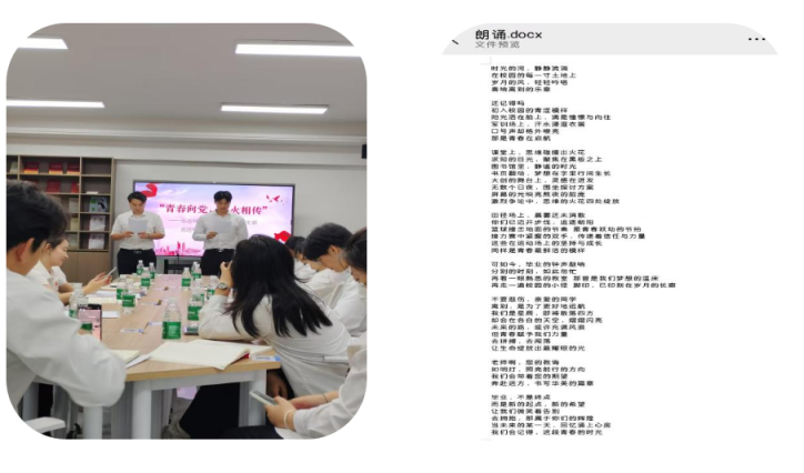 活动现场,温馨与感动交织。员工第三党支部胡天航和黄天成精心创作欢送诗歌,他们饱含深情地朗诵,一字一句,如潺潺溪流,淌进每一位毕业生党员的心田。诗歌里,满是对学长学姐们的感谢与不舍,诉说着在党组织温暖怀抱中共同成长的点滴,也寄托着对他们未来的美好憧憬。