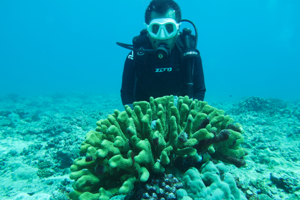王沛政在水下潜水进行珊瑚生态调查