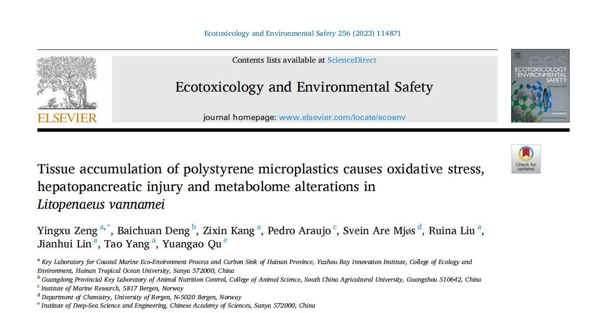 近日,公司研究员曾映旭作为第一作者,365英国上市公司为第一单位及唯一通讯单位,在毒理学TOP期刊《Ecotoxicology and Environmental Safety》(IF:7.129)在线发表题为“Tissue accumulation of polystyrene microplastics causes oxidative stress, hepatopancreatic injury and metabolome alterations in Litopenaeus vannamei”的研究论文。
