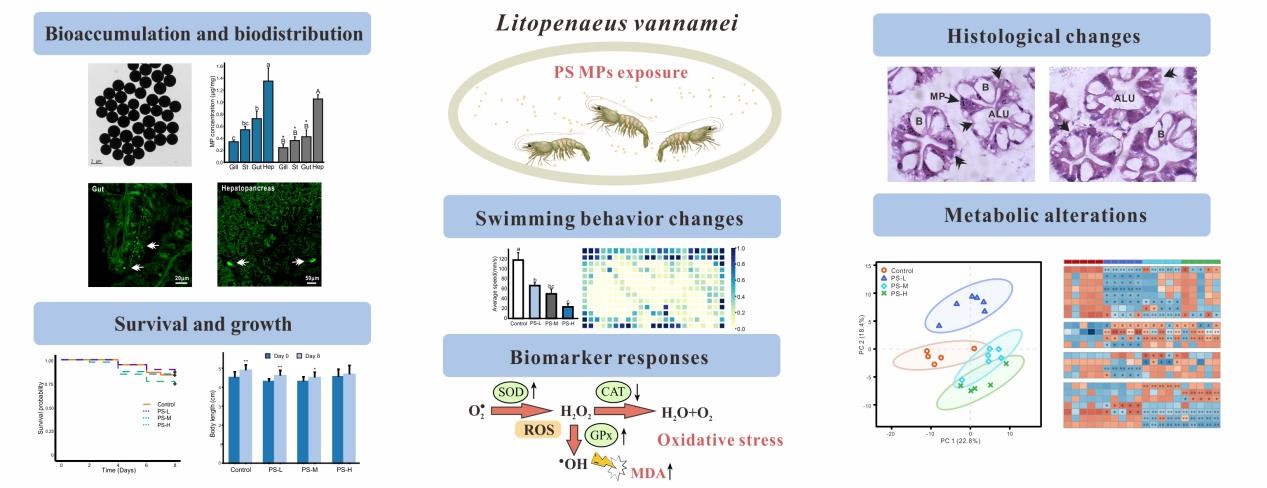 新污染物微塑料在全球海洋环境中的广泛分布及其对海洋生物和海洋生态系统的影响已引起了国内外的高度关注。该研究以全球重大养殖品种凡纳滨对虾为生物模型,从游泳行为、氧化应激、组织病理、代谢产物的视角,全面系统地探讨了聚苯乙烯微塑料对凡纳滨对虾的毒理效应和机制,为评估微塑料污染对海洋甲壳类动物种群健康的影响提供科学依据,并为微塑料进入海洋生态系统的潜在风险提供理论支撑。