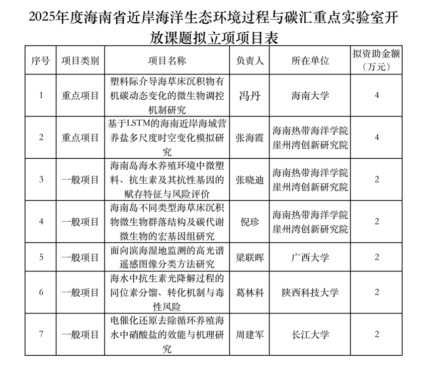 海南省近岸海洋生态环境过程与碳汇重点实验室关于2025年度开放课题拟立项项目的公示