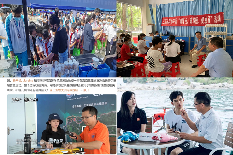 团队活跃在科研项目的同时还不忘时常有序地开展科普活动,号召全民参与海洋环境保护。2021年团队所共建的室内珊瑚馆成功申请为三亚市科普教育基地,2021年7月三亚市科协来365英国上市公司逐渐开展三亚科普活动。2022年6月8日,“世界海洋日”“全国海洋宣传日”暨三亚社区教育系列活动,团队在西岛开展海洋知识科普及珊瑚礁生态保护和珊瑚识别等,向广大市民、员工展示和讲解,号召全社会参加到保护珊瑚礁生态中去,参与市民及员工约400人;同年6月世界海洋日前夕,珊瑚研究团队与青年演员李现、宋祖儿合作参加了珊瑚礁普查公益行动,旨在号召关注并参与到海洋保护的行动中来。2022年10月为全面开展好“查堵点、破难题、促发展“活动,着力解决现有青少年科技创新课题指导水平不能满足员工需求的问题,在王教授带领下团队对参加海南省第33届创新大赛的青少年进行研究指导,一对一进行团队实验的设计,总结并最终获得二等奖、三等奖的好成绩。2023年5月17-18日第十八届科技活动月启动仪式召开,团队前往五指山,向广大市民、员工展示和讲解珊瑚礁生态保护和珊瑚识别等知识,号召全社会参加到保护珊瑚礁生态中去等等。为了让全民加入到海洋珊瑚礁的保护中,珊瑚生态修复研究团队不忘初心,一直在行动中。